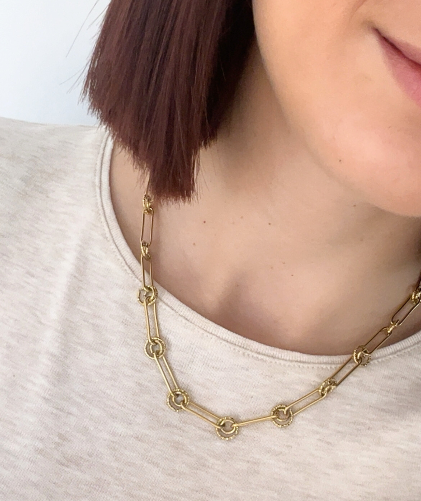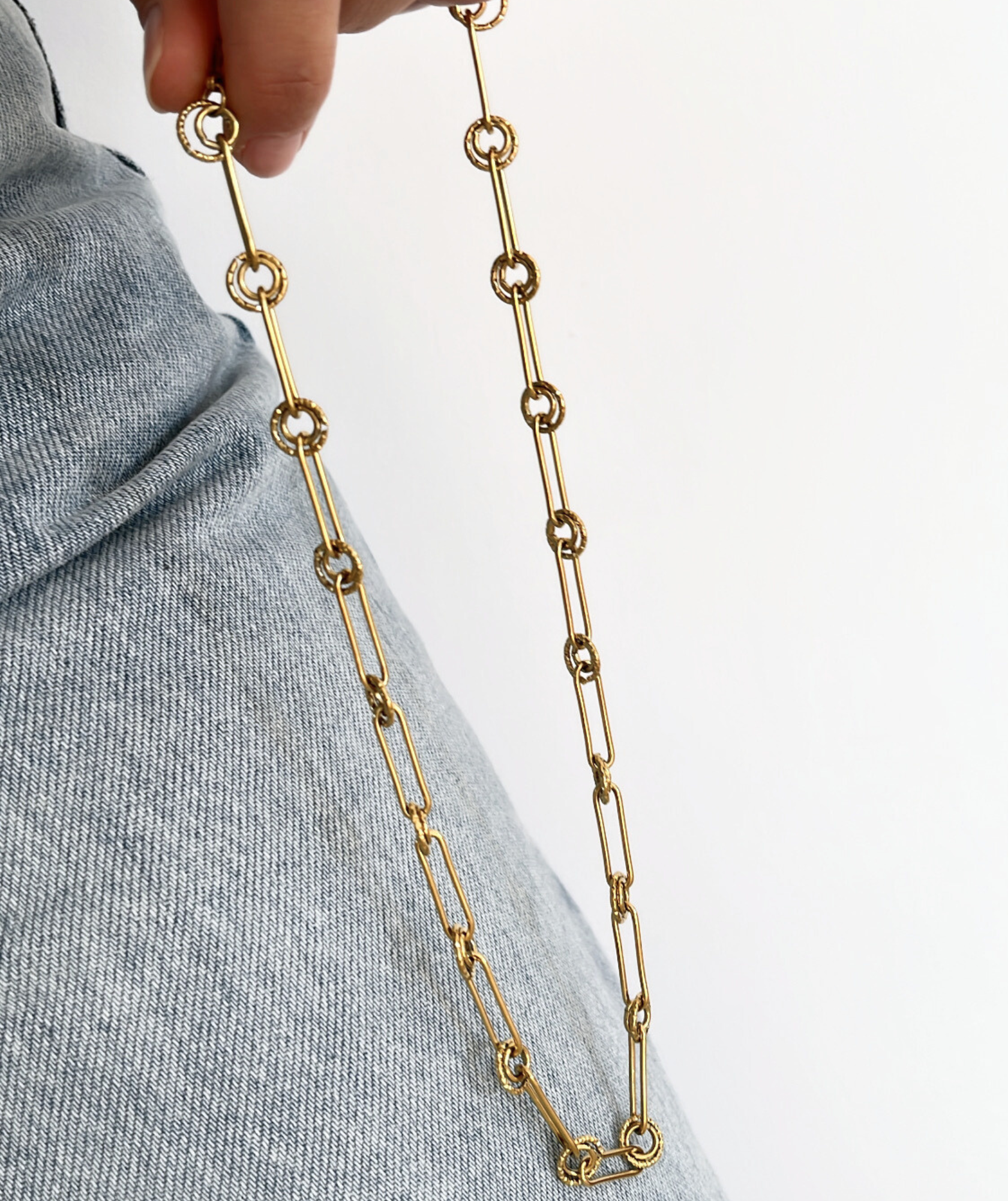 Un collier au style affirmé : ses maillons allongés et finement striés jouent avec la lumière pour un effet chic et contemporain. Un indispensable du vestiaire bijoux.