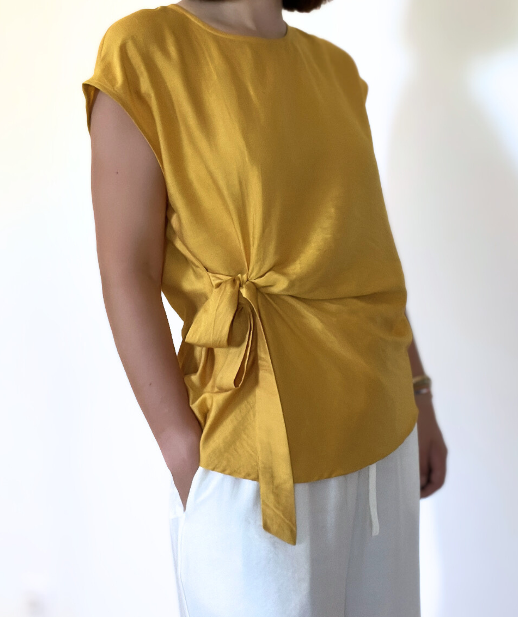 Apportez du peps à votre look avec ce top jaune lumineux, twisté d’un joli nœud sur le côté qui structure la silhouette avec style. Fluide et agréable à porter, il s’accorde facilement avec un pantalon blanc ou un short en jean pour un rendu élégant mais sans effort. Une pièce solaire qui fait toute la différence.
