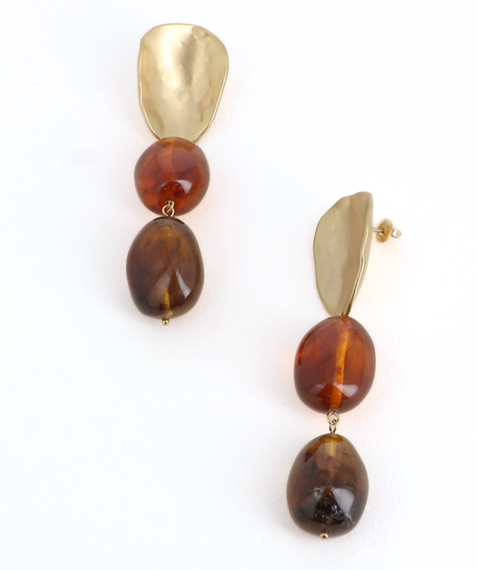 Ces boucles d’oreilles pendantes jouent avec les volumes et la transparence. Leur base dorée irrégulière laisse place à deux perles en résine ambre et fumée, aux reflets profonds. L’ensemble forme un bijou très visuel et léger.