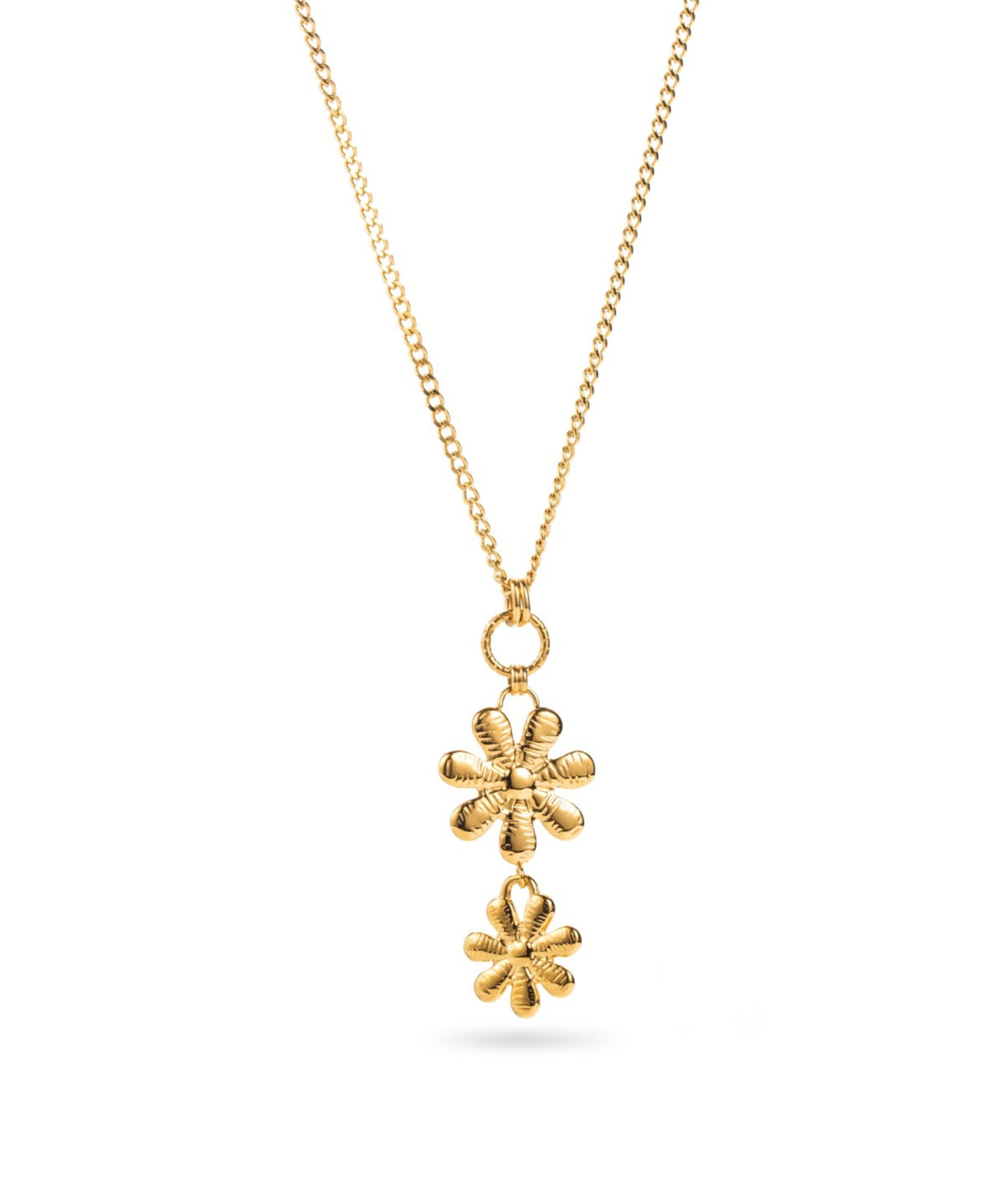 Faites fleurir votre style avec ce collier raffiné orné de deux pendentifs marguerites en cascade. Confectionné en acier inoxydable doré, il allie féminité et originalité avec ses détails texturés et son éclat solaire.