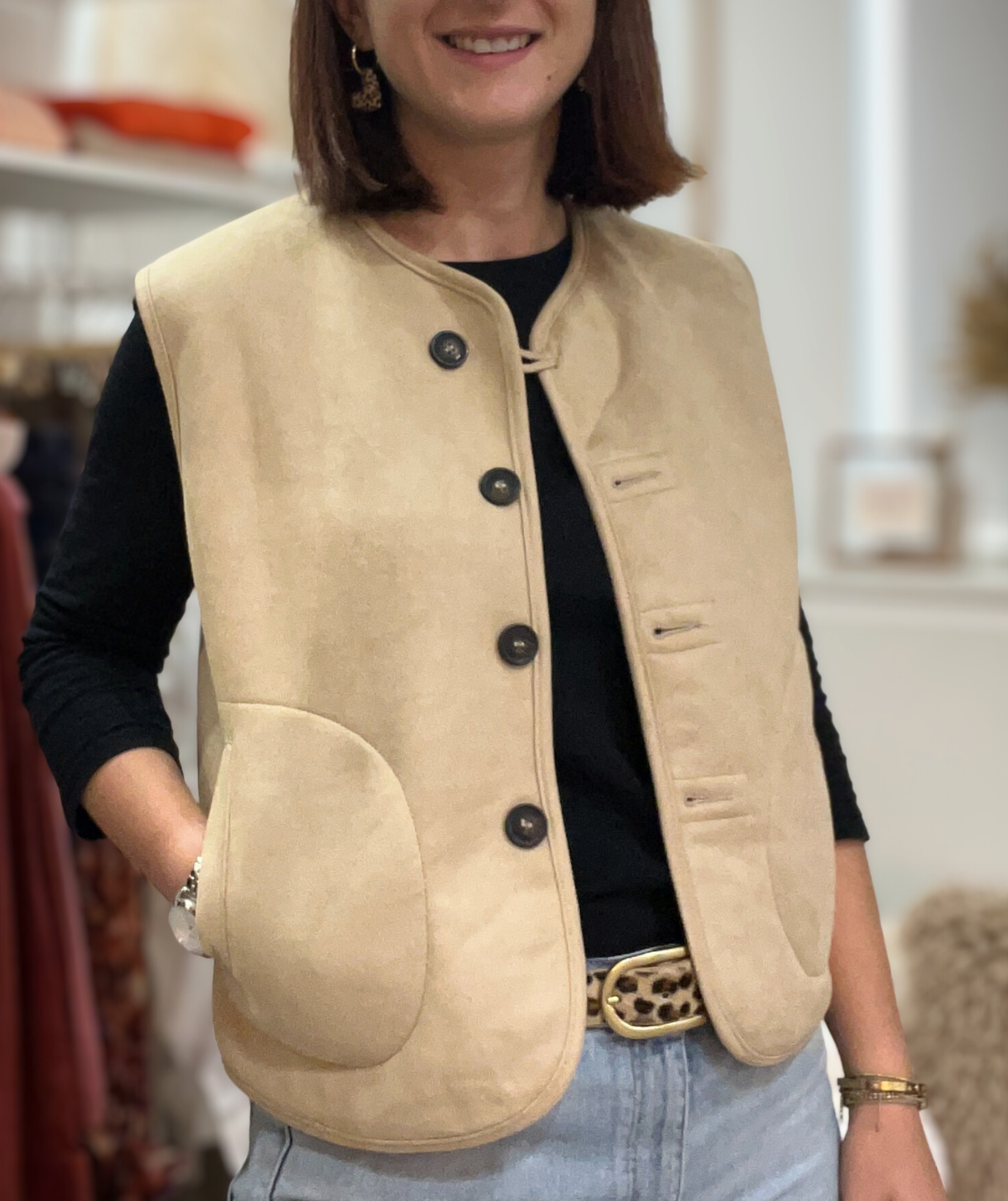 Ce gilet réversible beige est l’atout mode parfait pour vos looks de mi-saison. Avec son design deux-en-un, il vous permet de varier les styles selon vos envies. D’un côté, une matière effet daim pour une allure chic et structurée ; de l’autre, une texture effet moumoute ultra douce pour un esprit cocooning et décontracté.