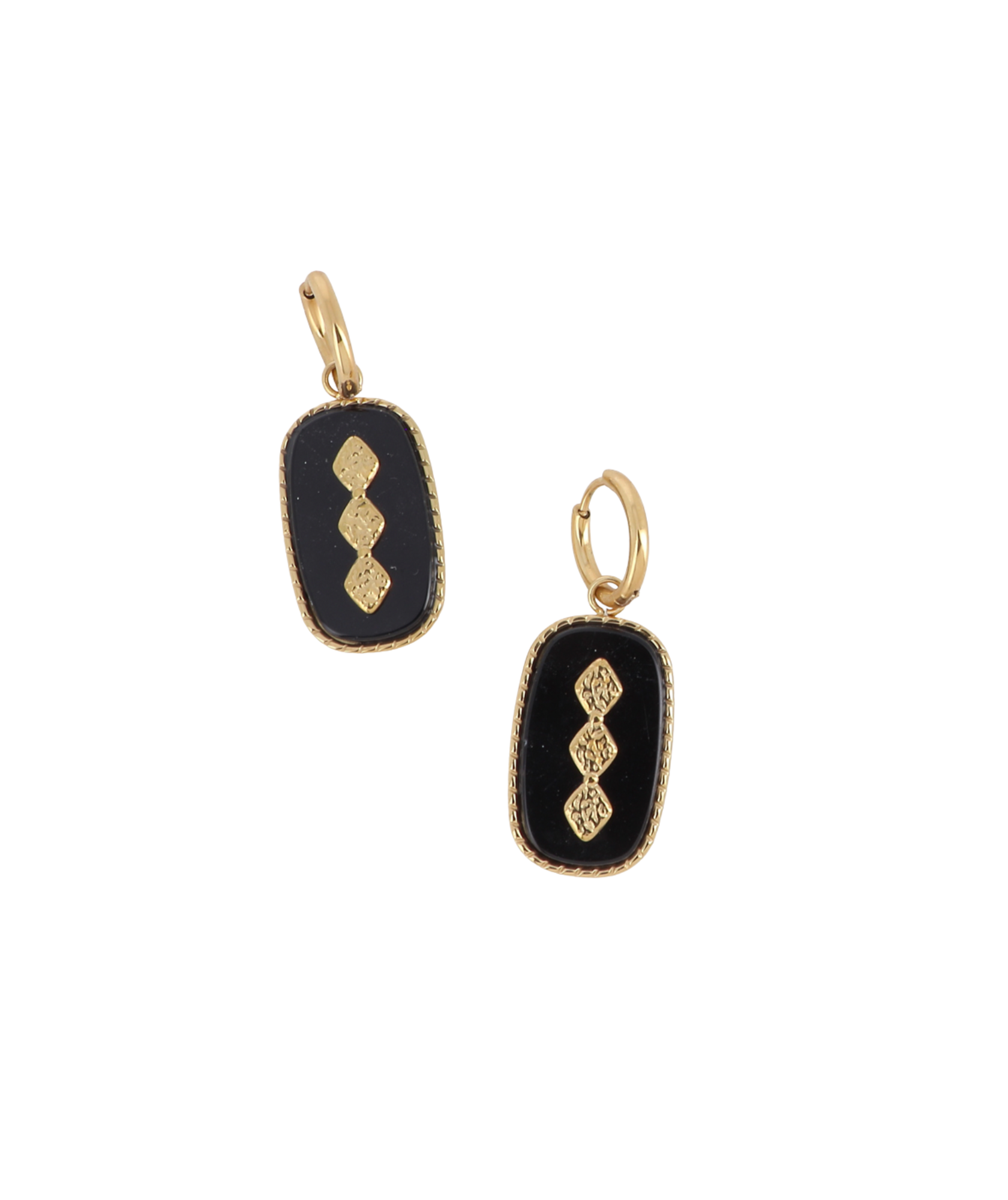 Sobres et sophistiquées, ces mini créoles dorées sont rehaussées d’une pierre noire (onyx), mise en valeur par trois motifs dorés martelés.