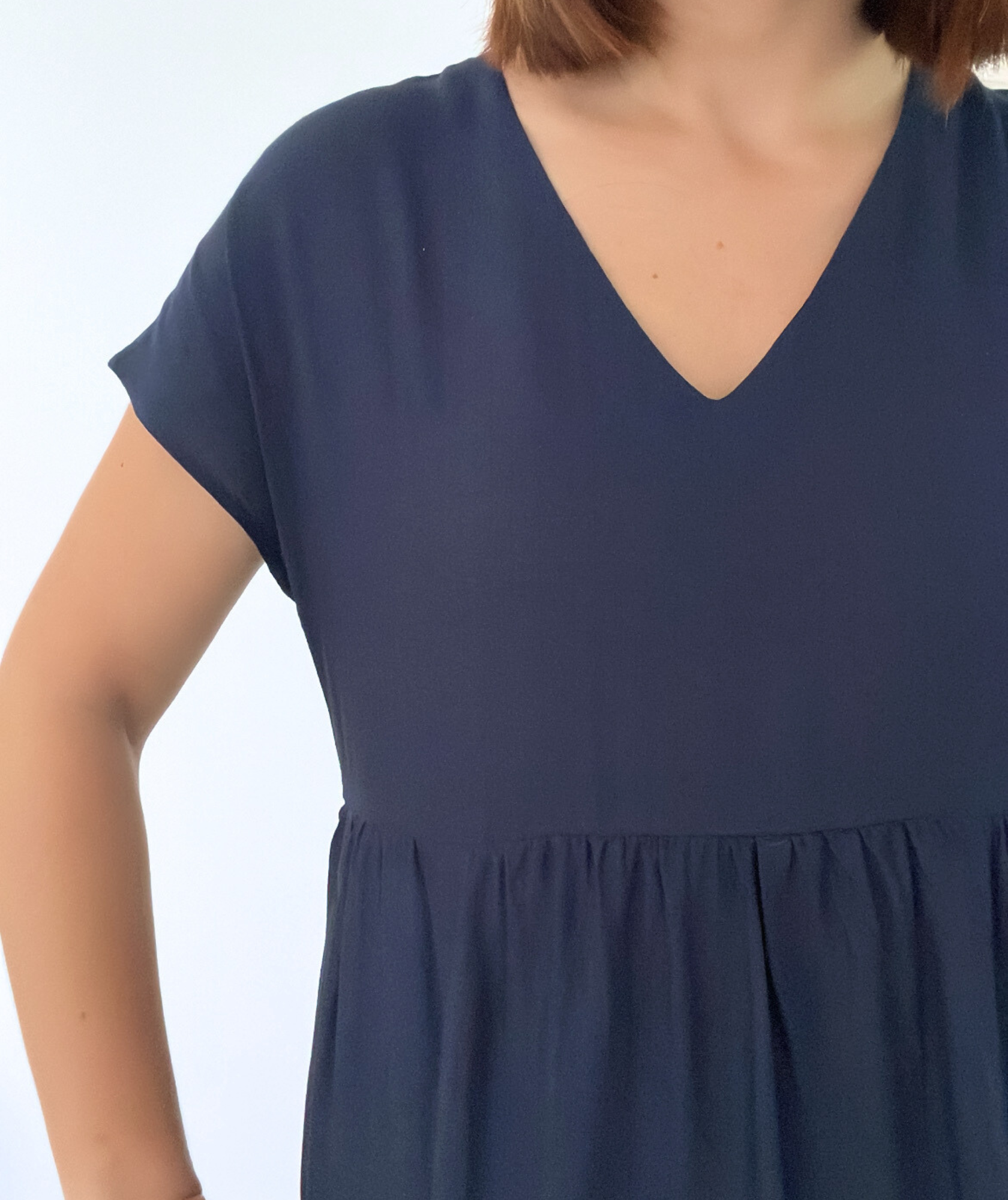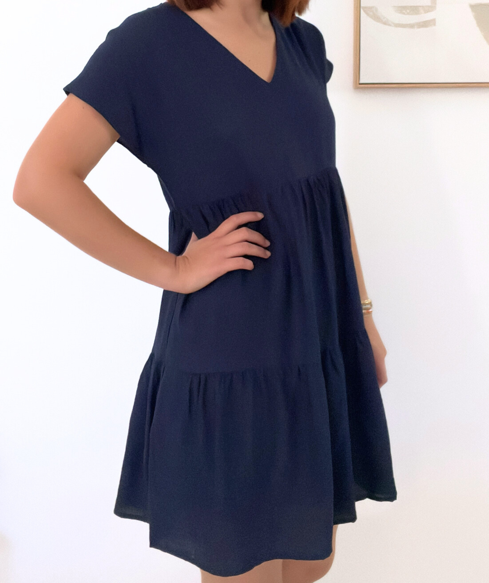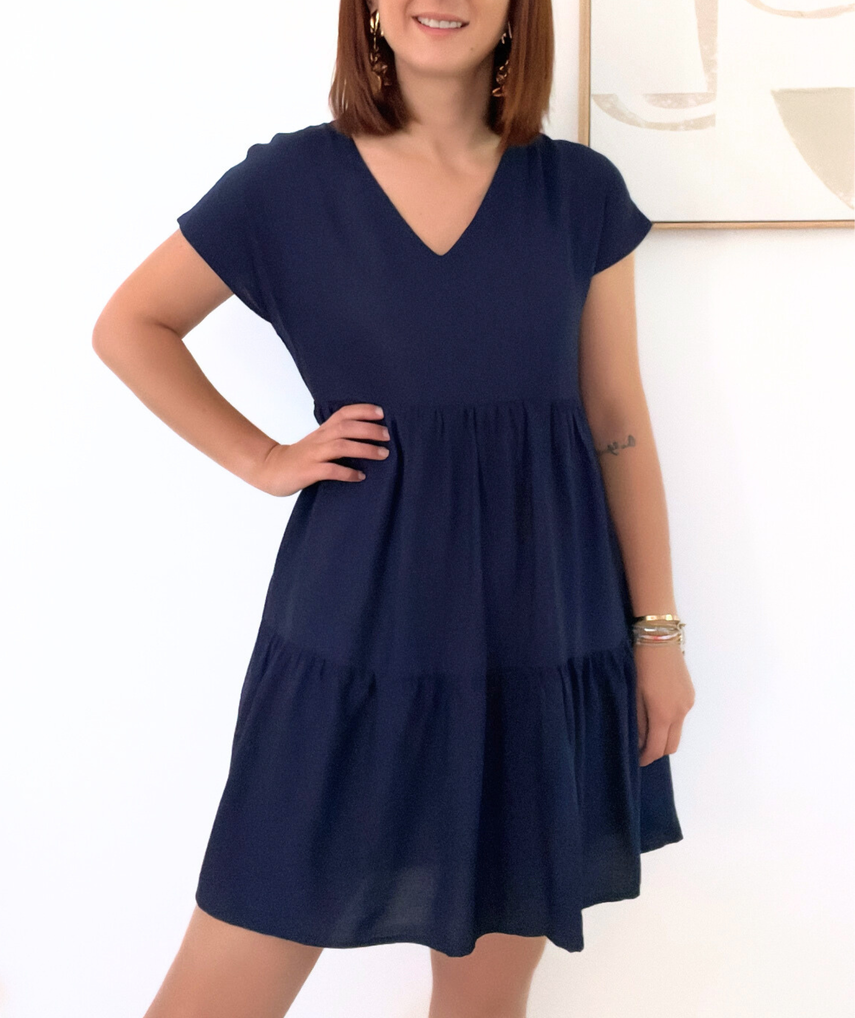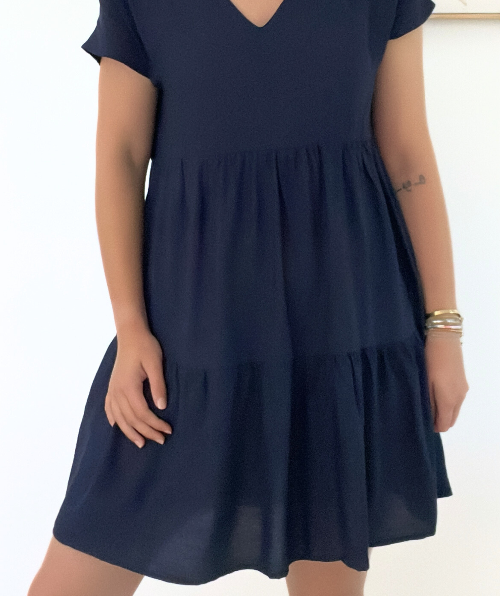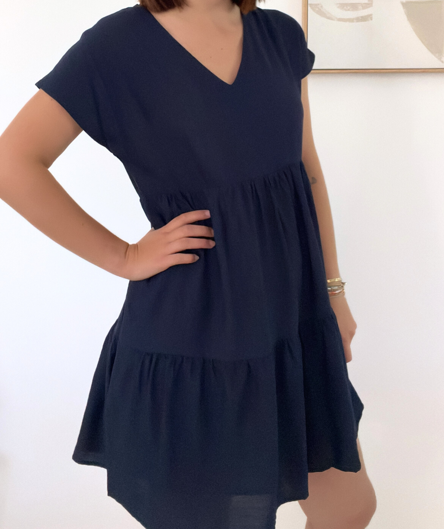 Classique et indémodable, cette robe bleu marine est un must-have. Sa coupe fluide avec jupe évasée et col V flatteur conviendra à toutes les silhouettes. Légère et confortable, elle se porte aussi bien de jour que de soir. À accessoiriser selon vos envies pour un look casual chic ou plus habillé.