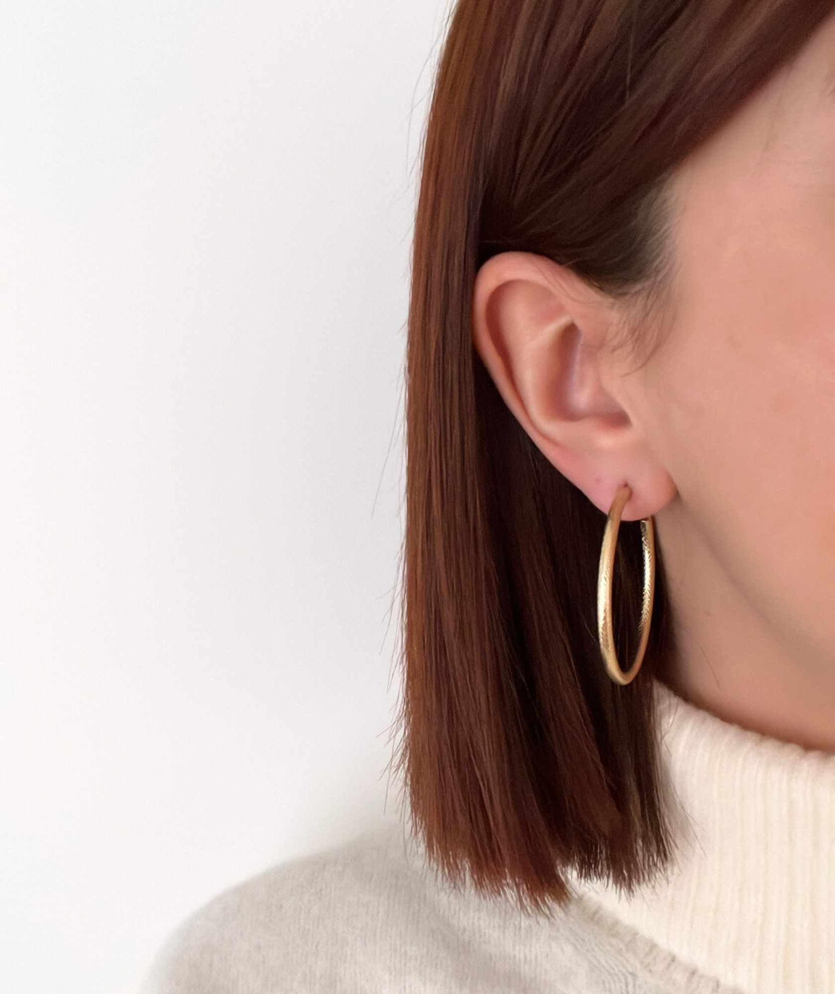 Ces créoles dorées à finition striée sont un incontournable du coffret à bijoux. Leur design classique, rehaussé d’un effet texturé subtil, en fait un accessoire facile à porter au quotidien comme pour les grandes occasions. Légères, intemporelles et élégantes, elles conviennent à tous les styles. Idéales pour un cadeau de Noël chic et sans fausse note.