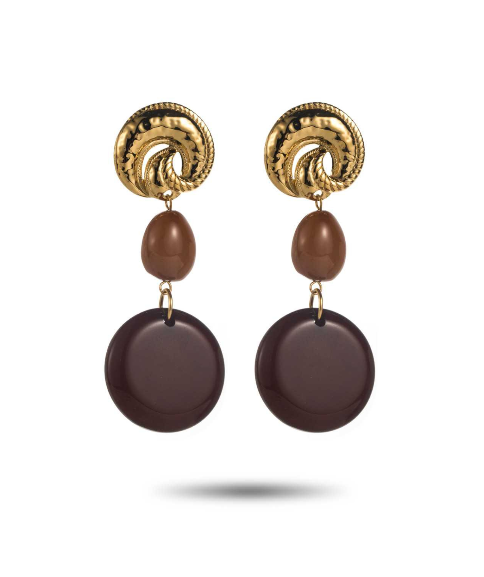 Ces boucles d’oreilles pastilles marron foncé subliment la saison avec leur palette chaleureuse et leur design structuré. Entre la base dorée texturée, la perle chocolat et la pastille marron profond, elles mixent avec brio sophistication et originalité.