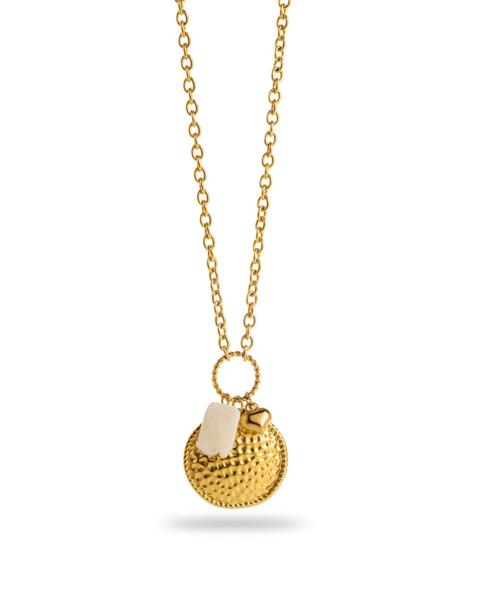 Un collier à forte personnalité : chaîne dorée texturée et médaillon rond martelé, rehaussé d’une pierre blanche naturelle. Le contraste entre la brillance de l’acier doré et l’aspect minéral de la pierre en fait un accessoire tendance, à porter seul ou en accumulation.