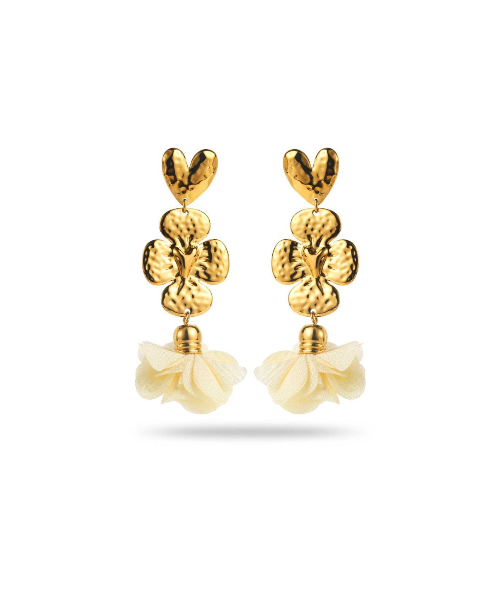 Ces boucles d’oreilles sont une invitation au romantisme. Elles mêlent des éléments martelés dorés en forme de cœur et de fleur, et se terminent par une délicate fleur beige en tissu. Une création à la fois douce et éclatante, parfaite pour apporter une touche de poésie à une tenue estivale ou de cérémonie.