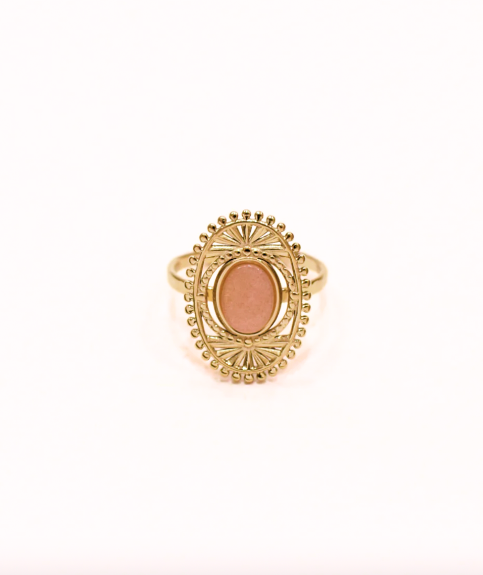 Un bijou qui attire la lumière. Cette bague ovale dorée incarne l’élégance rétro avec sa monture travaillée façon médaillon ancien. En son centre, une pierre rose "pierre de soleil" capte la lumière à chaque mouvement. Son anneau ajustable et sa matière en acier inoxydable en font une pièce à la fois pratique et précieuse. À porter en solo pour une touche vintage assumée ou combinée à d'autres bagues pour un look bohème chic.