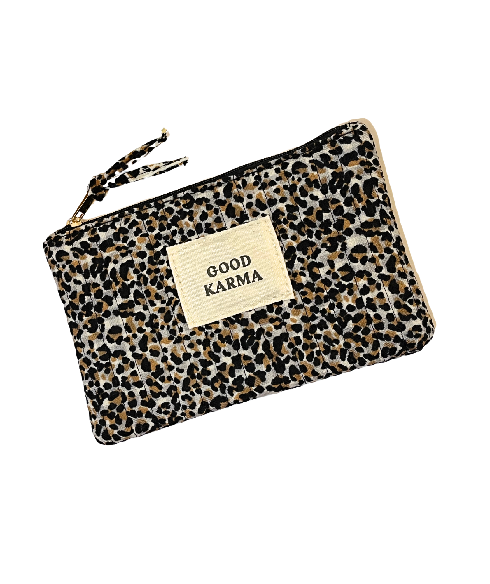 Cette pochette rectangulaire est en tissu avec motif léopard. Vous trouverez l'inscription "Good Karma" sur le devant de la petite trousse. Facile à transporter, la pochette est un accessoire parfait pour tout ce dont vous avez besoin à tout moment : maquillage, papiers et téléphone. C'est le cadeau idéal!