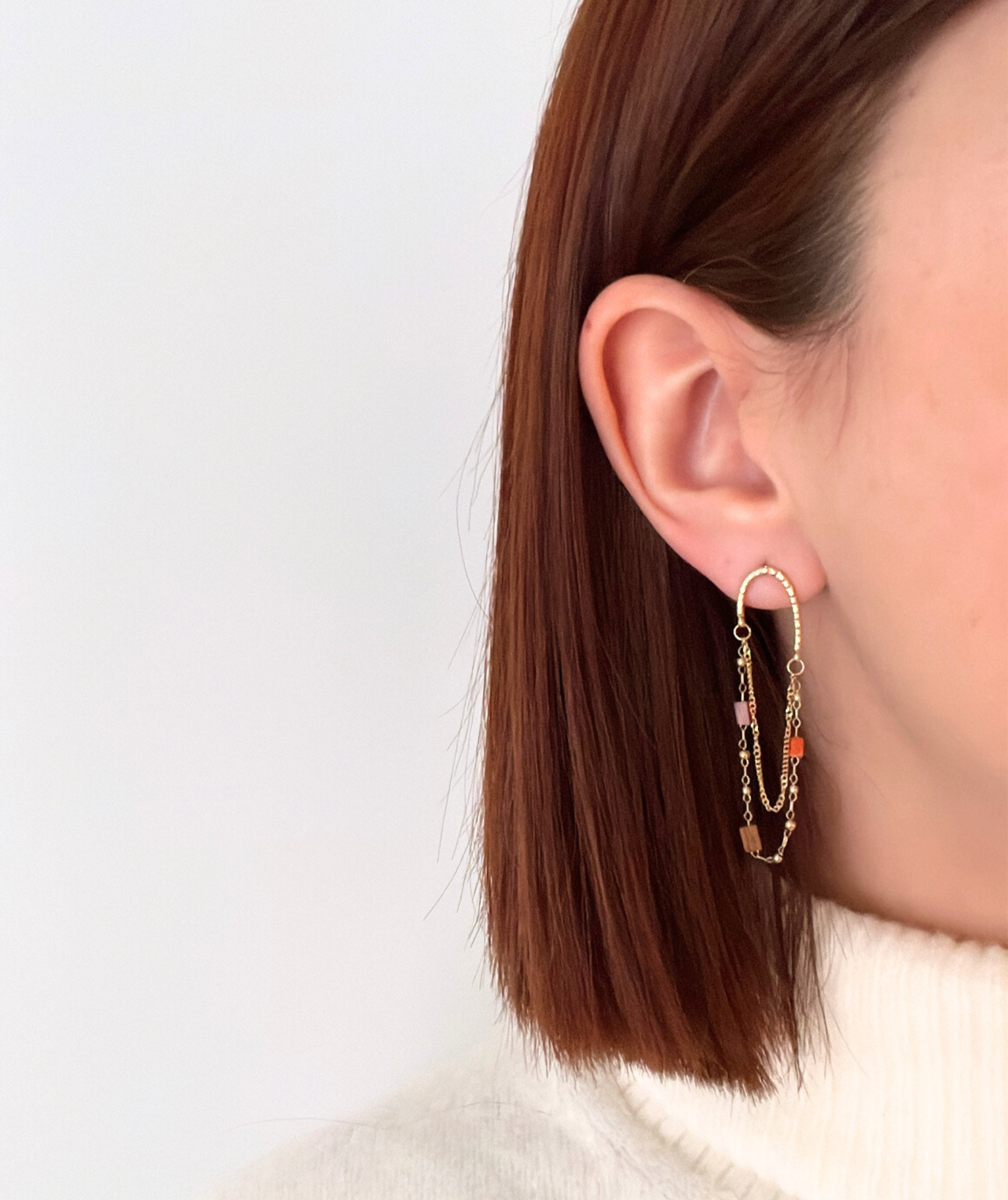 Ces boucles d’oreilles dorées jouent la carte de l’originalité avec leurs chaînes mobiles ornées de petites perles colorées. Leur silhouette moderne et asymétrique habille le lobe avec légèreté. Une paire audacieuse qui apportera de la personnalité à n’importe quelle tenue, parfaite pour surprendre à Noël avec un bijou plein de pep's.